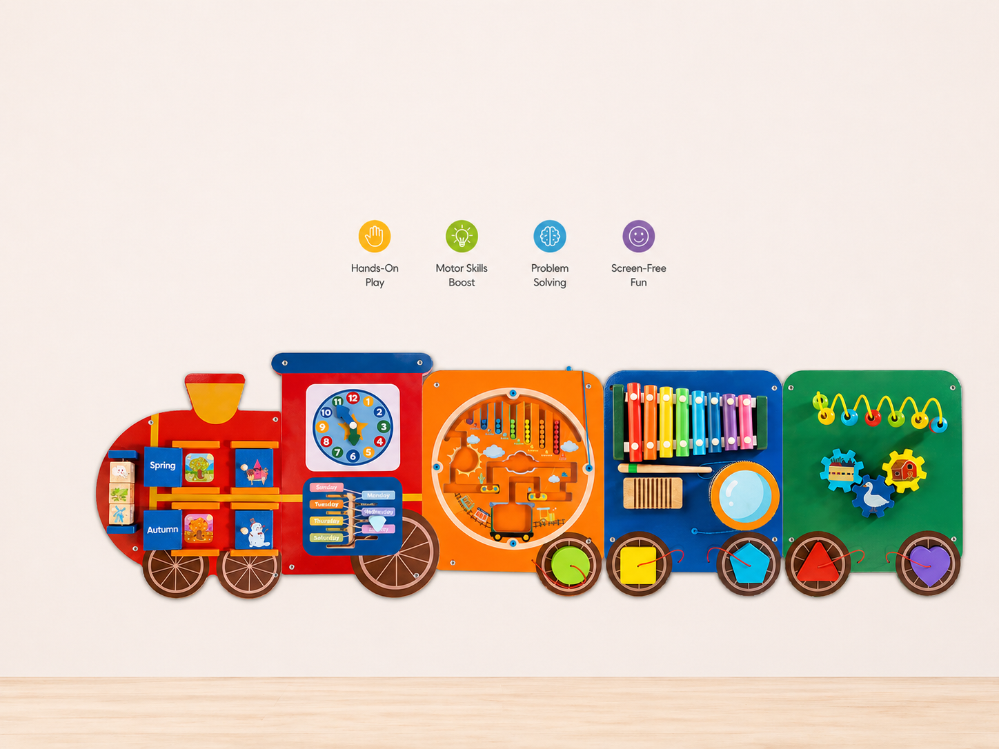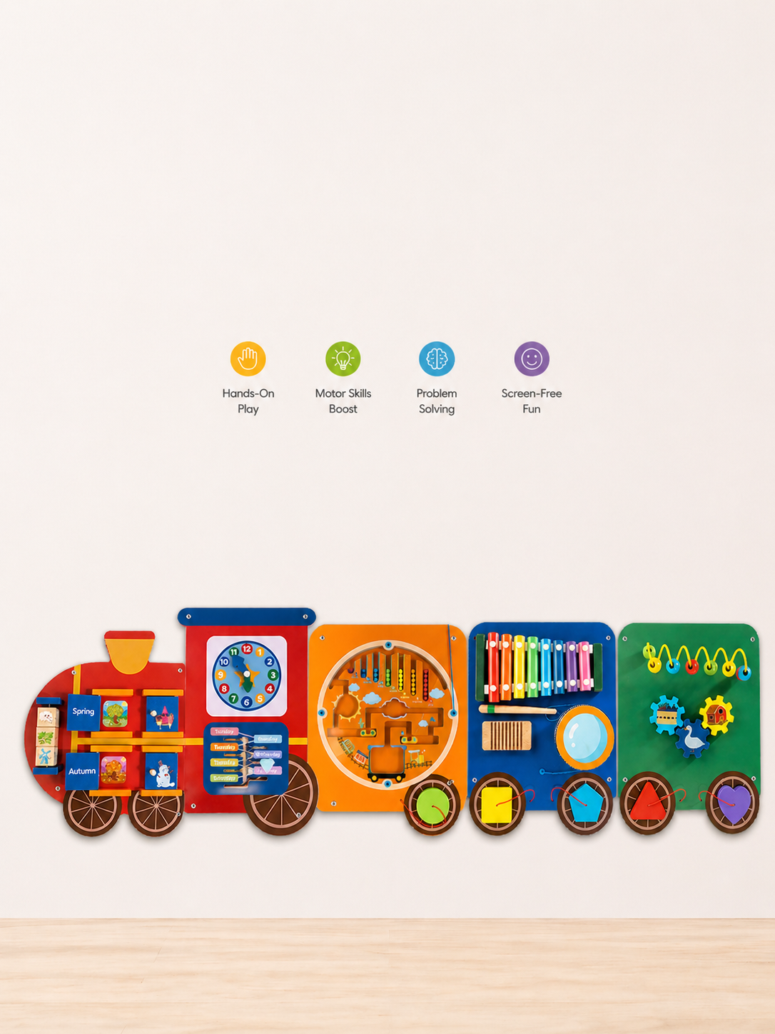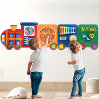 Train Activity Wall Busy Board Panels | 11-in-1 Wooden Sensory Wall Panel for Kids, Toddler Montessori Learning Activity Center